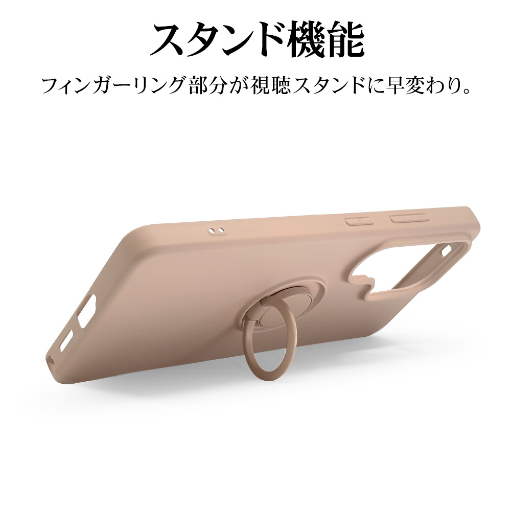 ●開いたリングに立てかけることで横置きの視聴スタンドとしても使用できます。※背面リングを使用する際は必ず端末とケースを一緒に手に持ってください。リングのみを持って宙づりにしたり、振り回す等の行為はしないでください。 端末の落下や本製品の破損の原因となります。