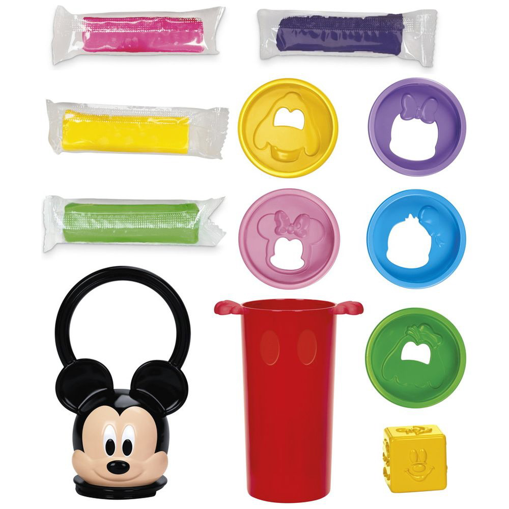 プレイセットには、ミッキーのふた(スタンプ付き)、カップ、ねんどの型5個、キューブ型スタンプ1個、ねんど4本が入っています。