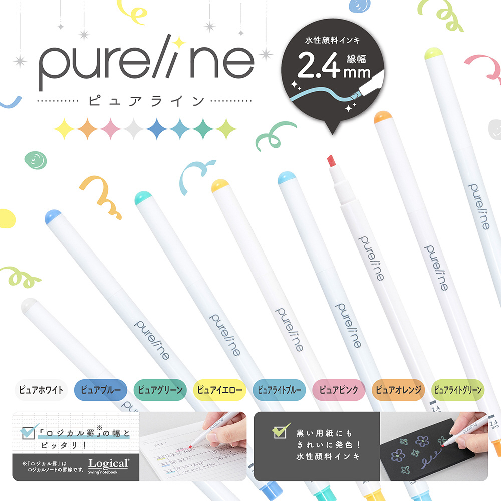 ピュアラインはスリムな線幅のラインマーカーです。一般的なラインマーカーの線幅が4mmに対して本製品は2.4mmと細く、ペンケースに収納してもかさ張りにくく持ち運びに便利です。またこの線幅は当社製品ロジカルノートやロジカルダイアリーに使用されているロジカル罫の罫幅にもあうようになっています。