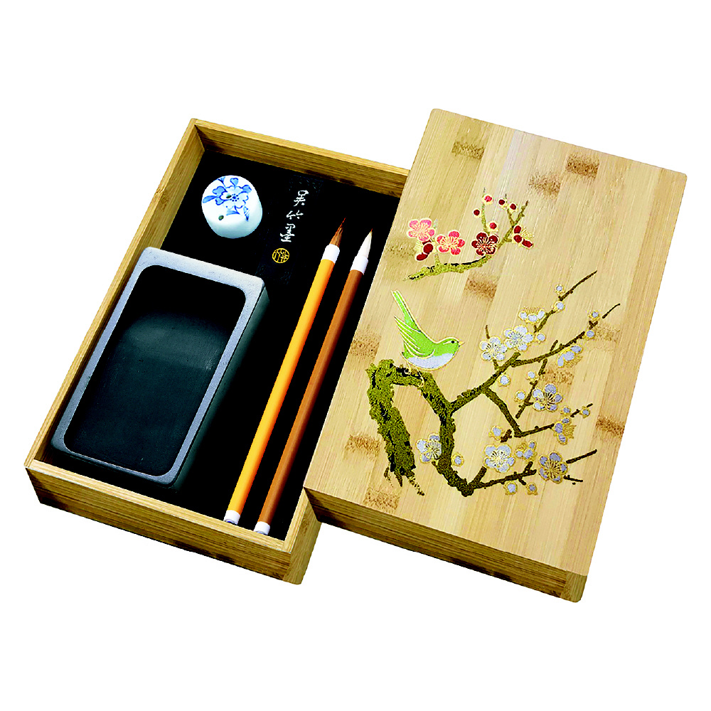 素材:墨:煤・膠・香料/筆:ABS・羊毛・馬毛/硯:天然石/水差:陶器/硯箱:竹