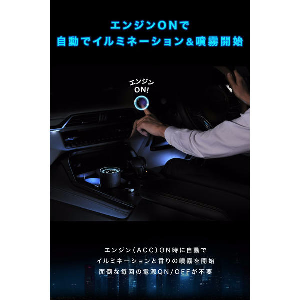 前回の設定モードを記憶して、エンジン(ACC)ON時に、自動で噴霧とイルミネーションを開始*。