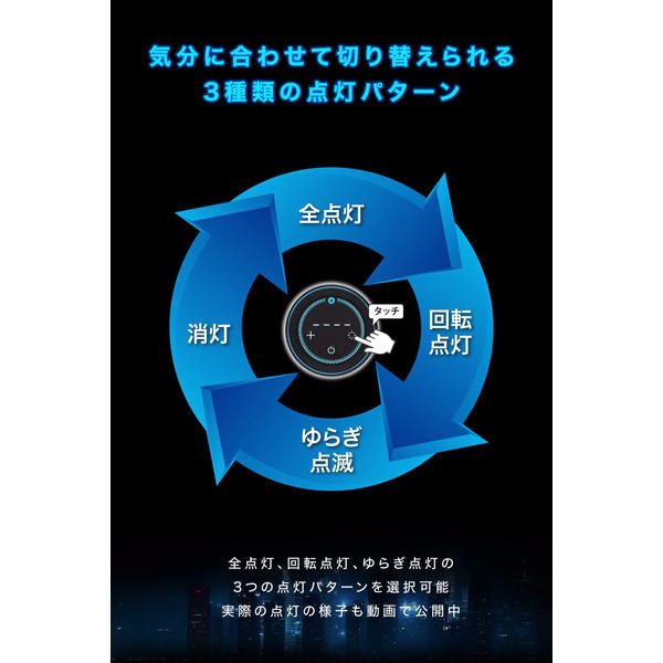 全点灯、回転点灯、ゆらぎ点灯の3つの点灯パターンと消灯モードを搭載。
