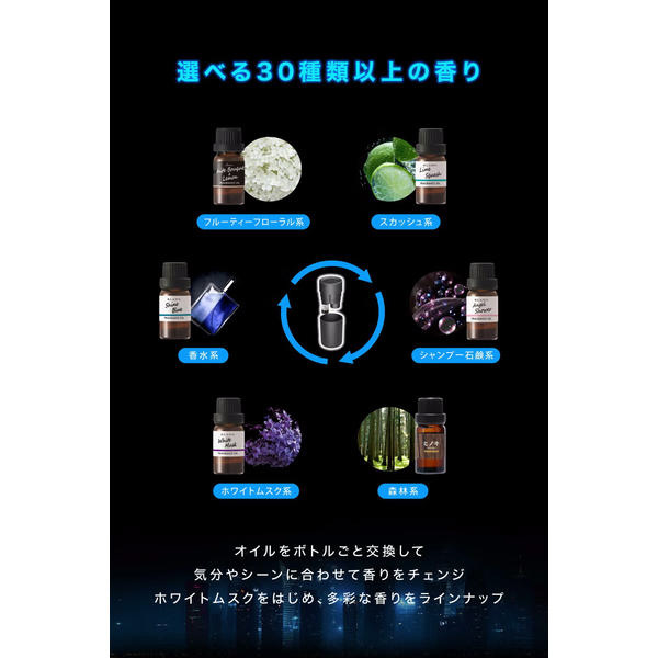 ボトルを交換するだけで、簡単に香りをチェンジできるので、気分やシーンに合わせて香りを選べます。