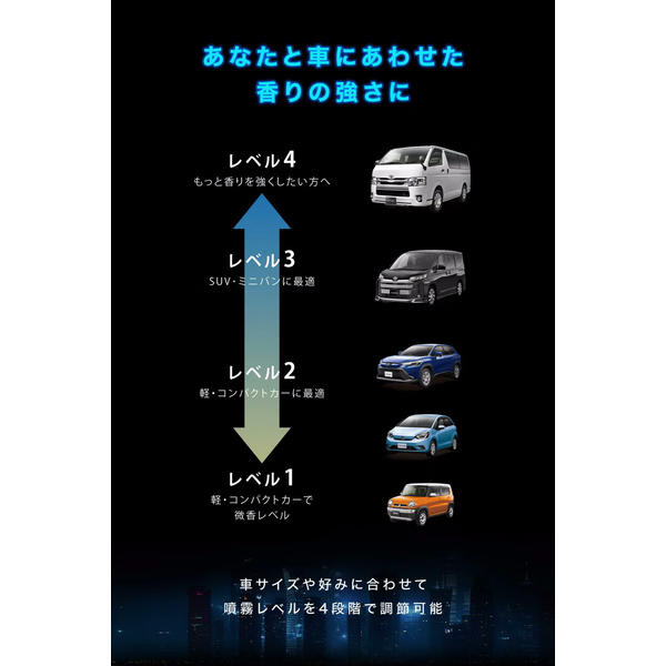 レベル4で使用すれば、芳香剤を何個も使わないと香りが楽しめなかったミニバンなどの大型車もこれ一台で充分に香りをいきわたらせることができます。