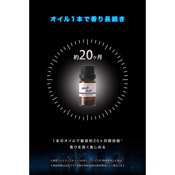 専用フレグランスオイル7mlをレベル1で1日1時間使用した場合、最長で約20ヶ月香りが持続します。