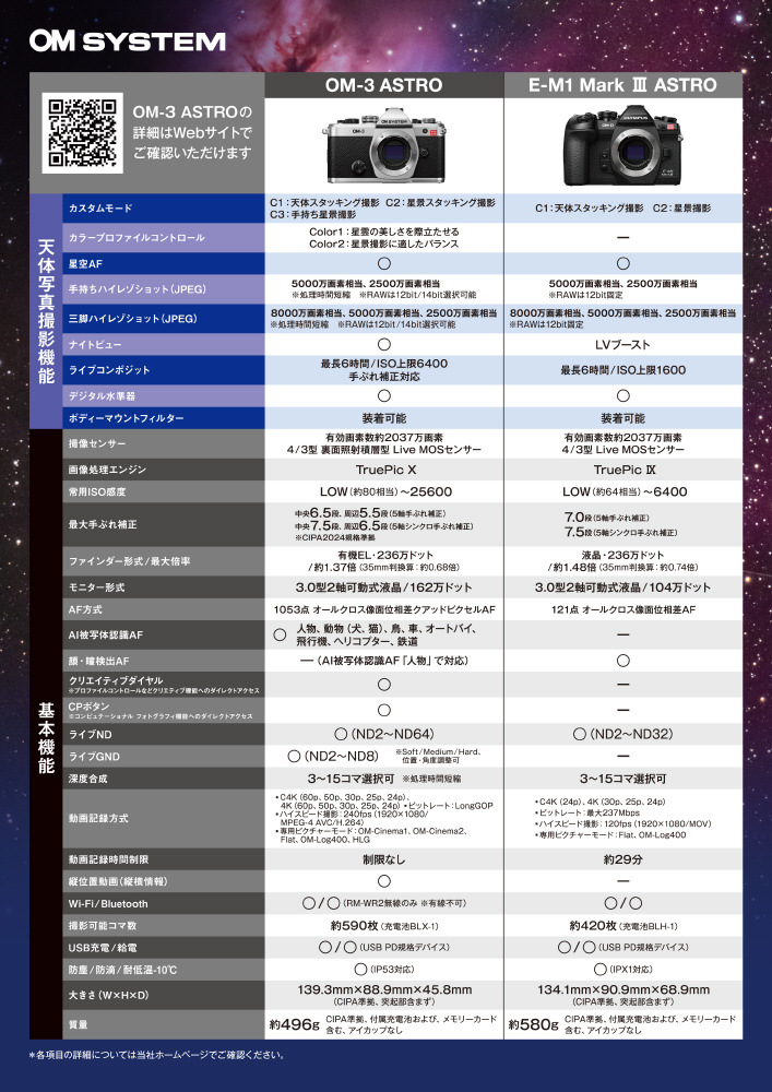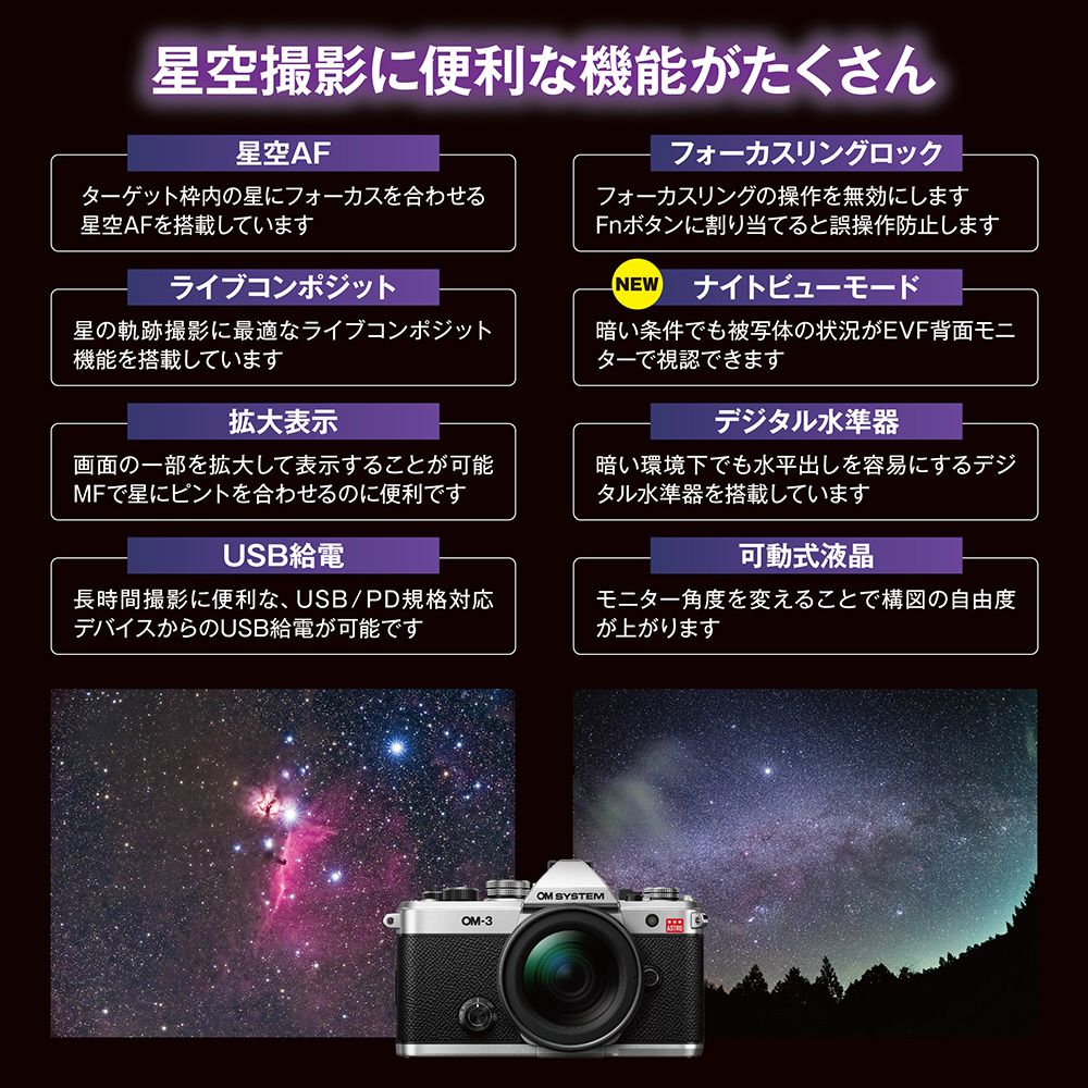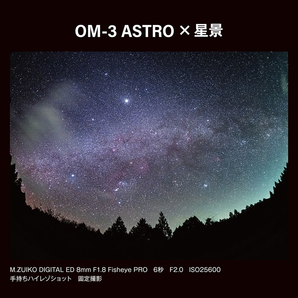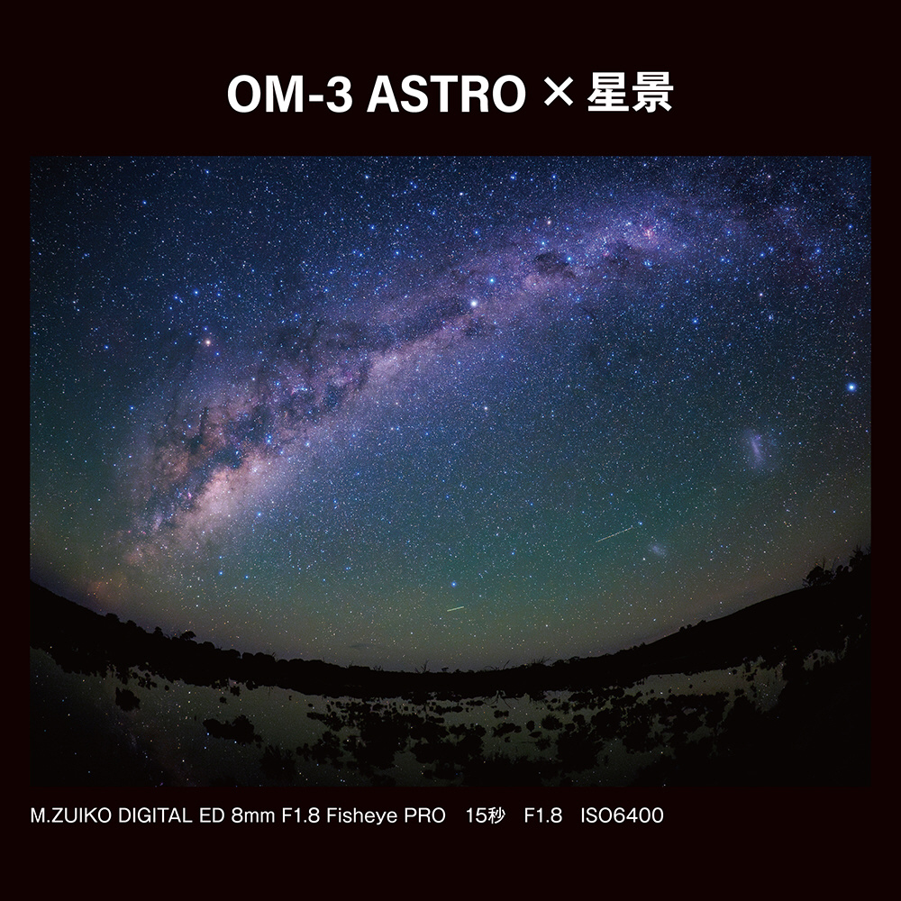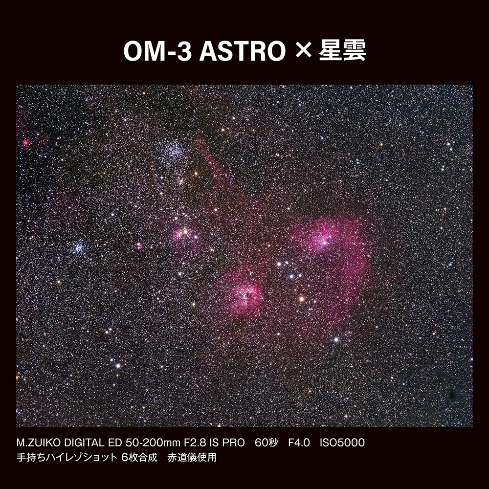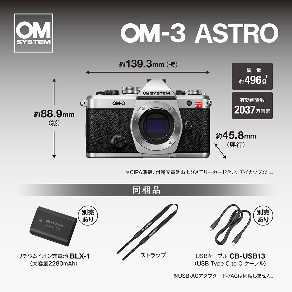 「OM-3」をベースに、センサー前方に配置されているIRカットフィルターの光学特性を天体撮影用に最適化し、天体写真愛好家に人気の高い赤い星雲を色鮮やかに撮影することができる天体撮影専用カメラ。