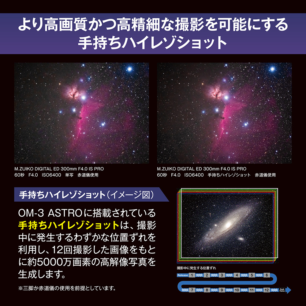 「OM-3 ASTRO」に搭載されている「手持ちハイレゾショット」は、撮影中に発生するわずかな位置ずれを利用し、12回撮影した画像をもとに約5,000万画素の高解像写真を生成します。画像合成の際に一枚一枚の画像の位置合わせを行うため、三脚に固定した状態で「手持ちハイレゾショット」撮影を実行することで、日周運動による星の動きが補正された合成画像が生成されます。(*3)また、赤道儀使用時においては、追尾誤差で生じる星のずれが補正された合成画像が生成されます。(*3)