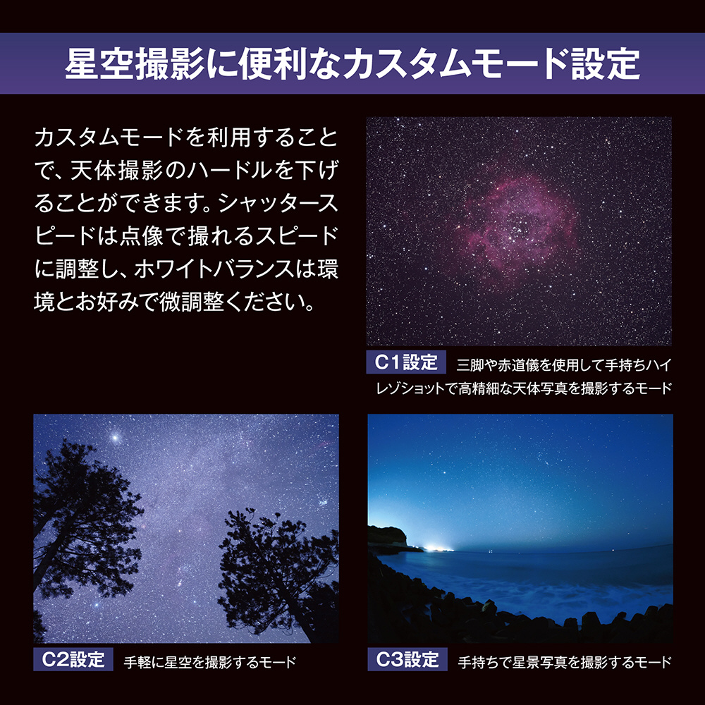 カスタムモード C1〜C3 には、COLOR1 に赤い星雲などの天体撮影向け、COLOR2 に星景撮影向けのカラープロファイルをプリセットしており、カスタムモードとカラープロファイルを組み合わせることで、手軽に印象的な星空撮影ができます。