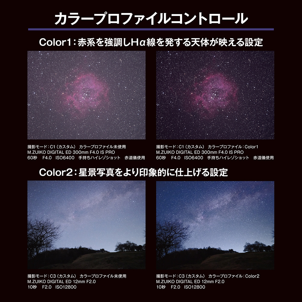 「OM-3 ASTRO」が持つカラープロファイルコントロール機能で天体写真や星景写真をより印象的な表現に仕上げることができます。