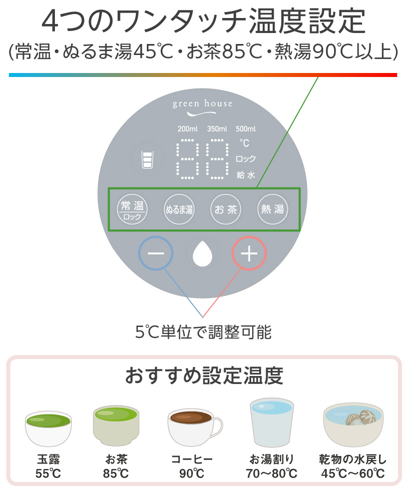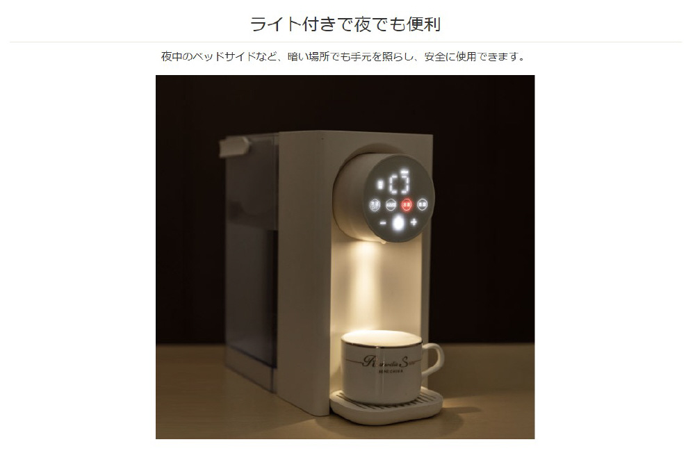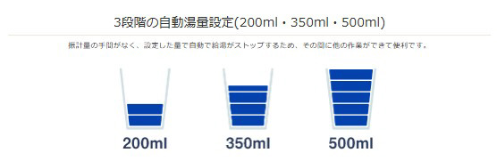 ●温度設定 25℃〜90℃以上、±5℃温度調整可能 ●出湯量 200ml/350ml/500ml ●安全機能 チャイルドロック・空焚き防止機能 ●動作温度範囲 5℃〜38℃ ●動作湿度範囲 10%〜85%(結露無きこと)