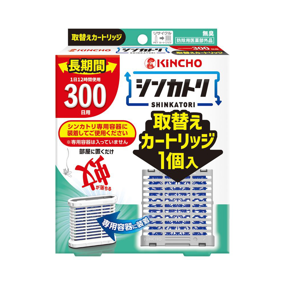 300日用の取替えカートリッジ。シンカトリ専用容器に装着してご使用ください。シンカトリ本体シリーズすべての容器でご使用いただけます。1日12時間使用で約300日使可能。今年の夏も快適に過ごしませんか