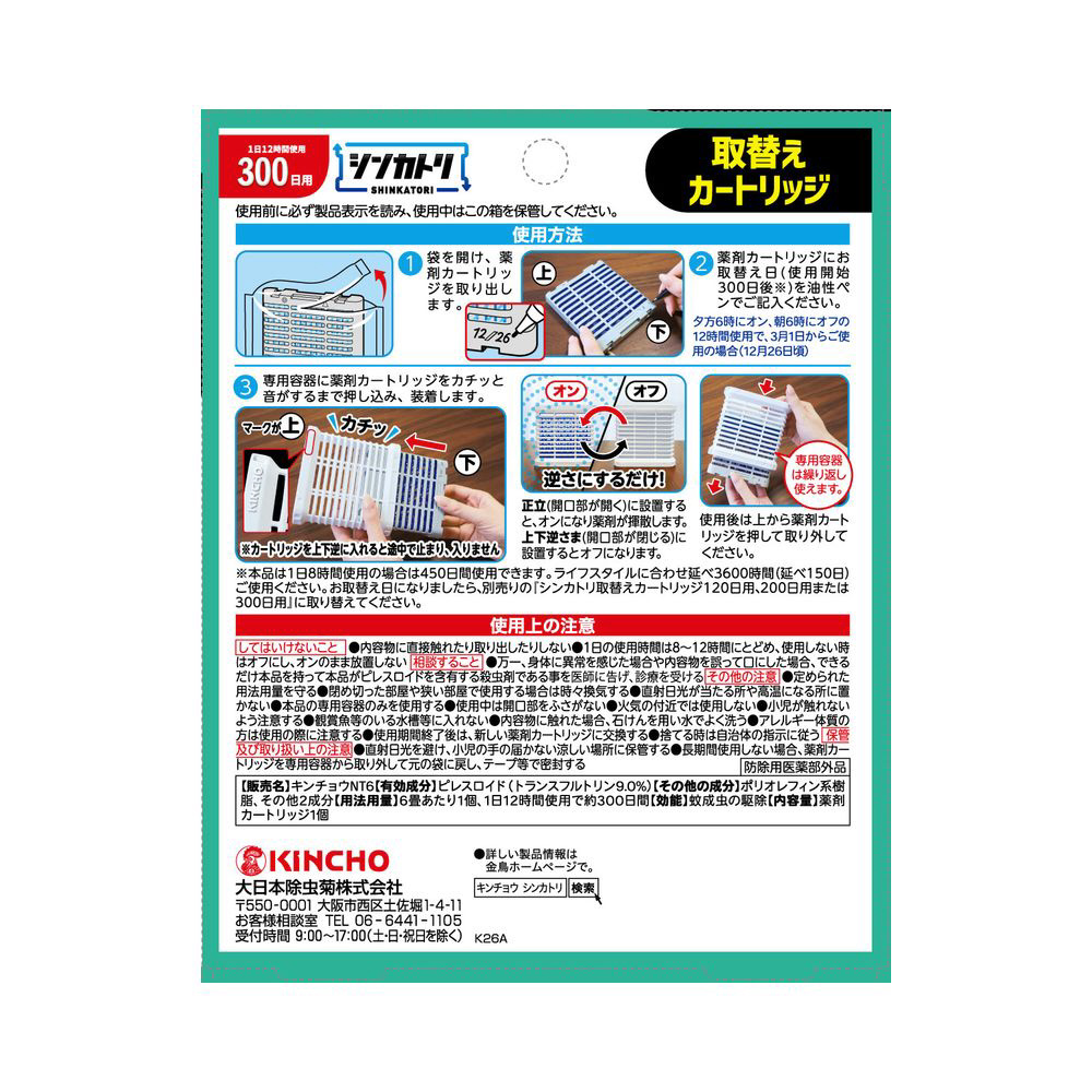 次世代型屋内蚊取り。300日用取替えカートリッジ。シンカトリ専用容器に装着してご使用ください。1日12時間使用で約300日使えます。