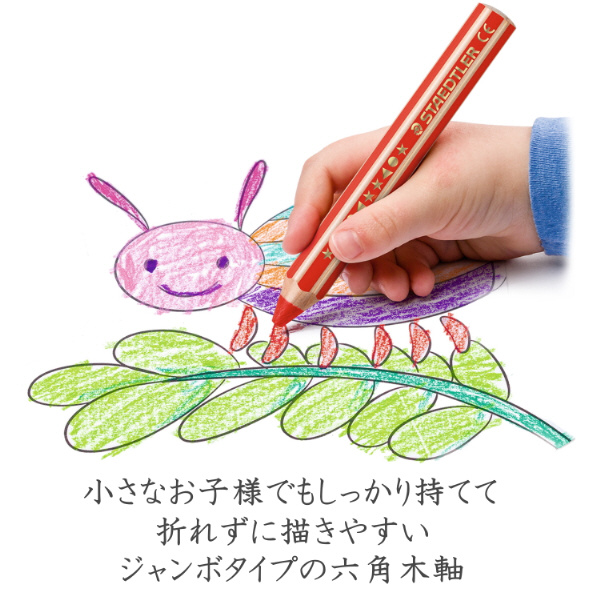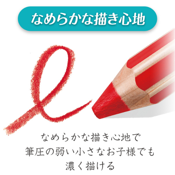2才から楽しめる、なめらかな描き心地の太い六角木軸色鉛筆です。小さなお子様でも持ちやすく、手も汚れずに快適にお絵描き頂けます。