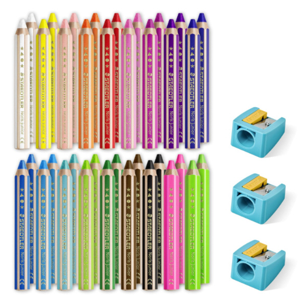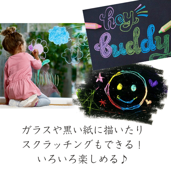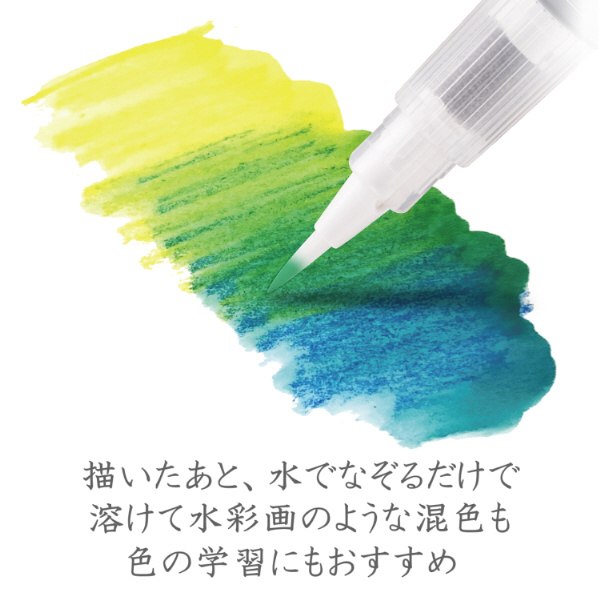 描いたあと、水でなぞると絵の具のように混色できます。ガラスなど、つるつるした面にも描け、さらに水拭きで落とせます。黒い紙にも描くことができます。お子様が誤って指を傷つけないようセーフティ機能の付いた専用鉛筆入り。セット内容:しろ、きいろ、うすだいだい、オレンジいろ、あか、ピンク、ワインいろ、むらさき、るりいろ、あお、みずいろ、トルコいしいろ、きみどり、みどり、こげちゃいろ、くろ、ぎんいろ、きんいろ ×各2本。専用鉛筆削り×3個入り。