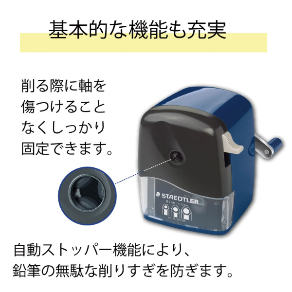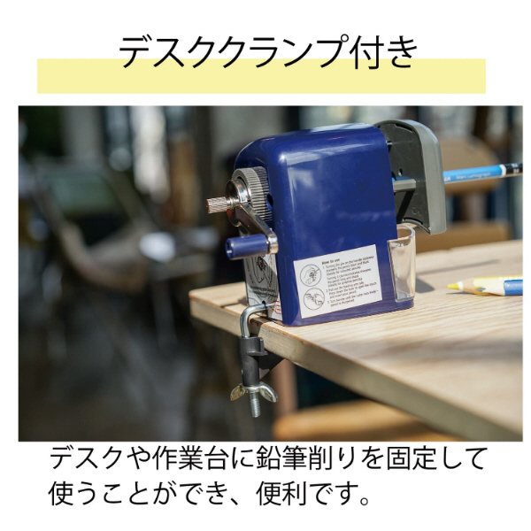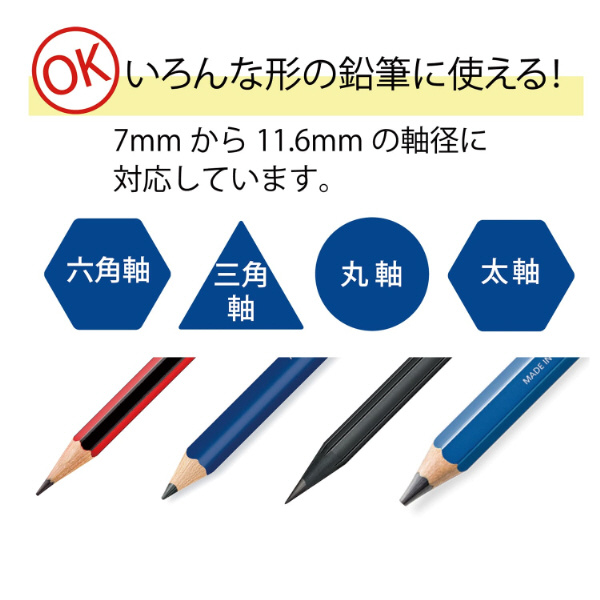 六角軸、三角軸、丸軸などの形状、また、7〜11.6mmまでの太さの鉛筆や色鉛筆が削れる本格式の手動シャープナー。
