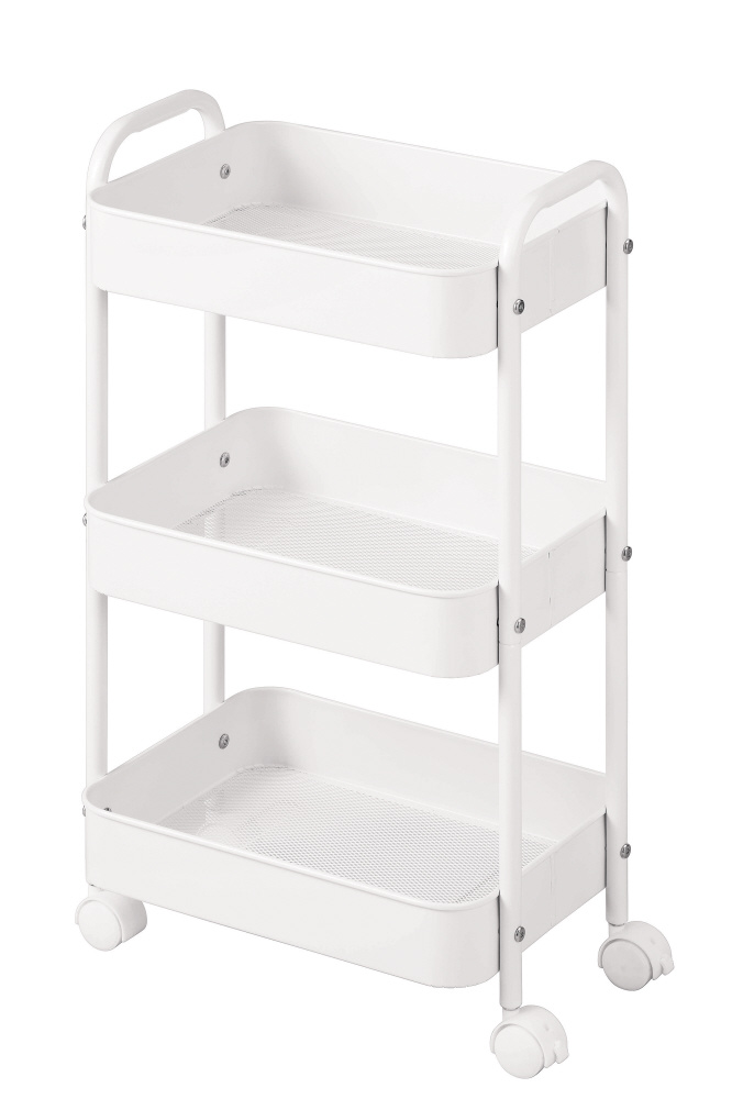 どんな空間にもフィットするシンプルなキャスター付収納ワゴン。メッシュトレーなので通気性抜群。トレーあたり、500mlペットボトル×12本収納可能。キッチンにもリビングにも馴染みやすいモノトーンカラー。本製品は家庭用です。耐荷重以内で使用してください。支柱やネジがゆるむことがありますので、定期的に締め直してください。汚れ等を放置すると錆の原因となります。