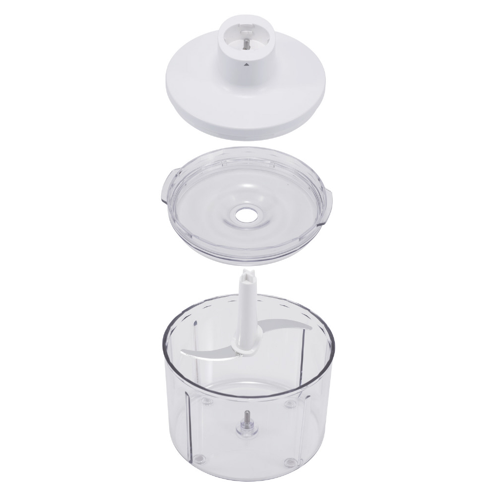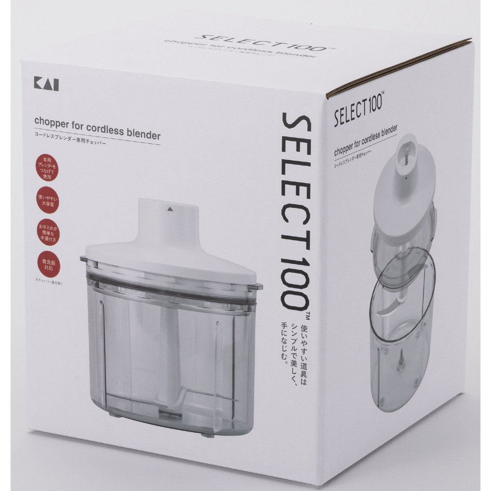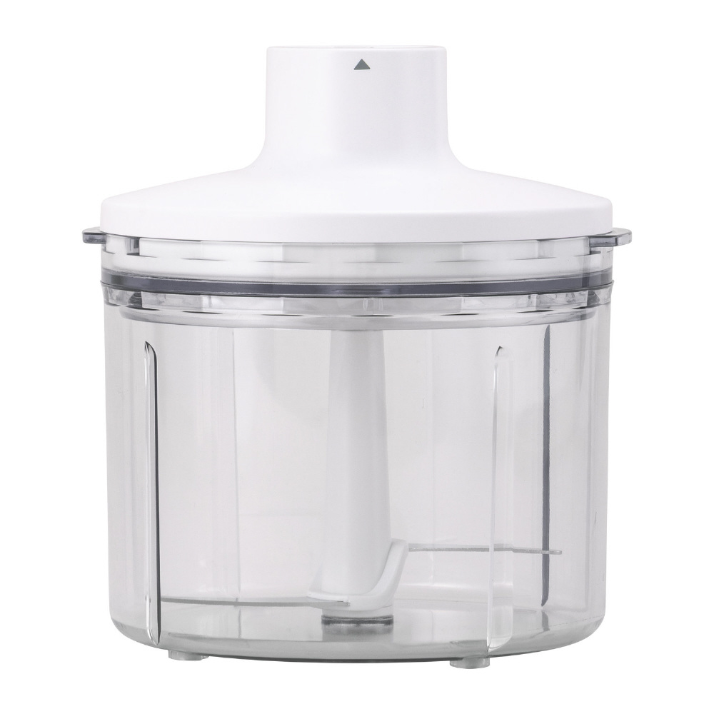 機能特長・作業効率のよいコードレスタイプ(ブレンダーを付けて使用) ・コードレスタイプとしては、他社にない容量の大きさのチョッパーです。カレーサイズの冷蔵の角切り肉(300g/ハンバーグ3人分)を好みの粗さでミンチにすることができます。 ・容器内側リブの効果で、むらなく短時間でみじん切りをすることができます。 ・刃の位置が低く、切り残しが出にくい構造です。◆外観 ・持ちやすく、重量を感じにくい形状。キッチンになじむシンプルなカラー。◆お手入れ ・中蓋があるため、チョッパーが汚れにくく清潔にお使いいただけます。 ・汚れが付きにくい形状と表面素材&仕上げ。容器底に角Rを付けることで、食材汚れがたまりにくく洗いやすい形状にしています。