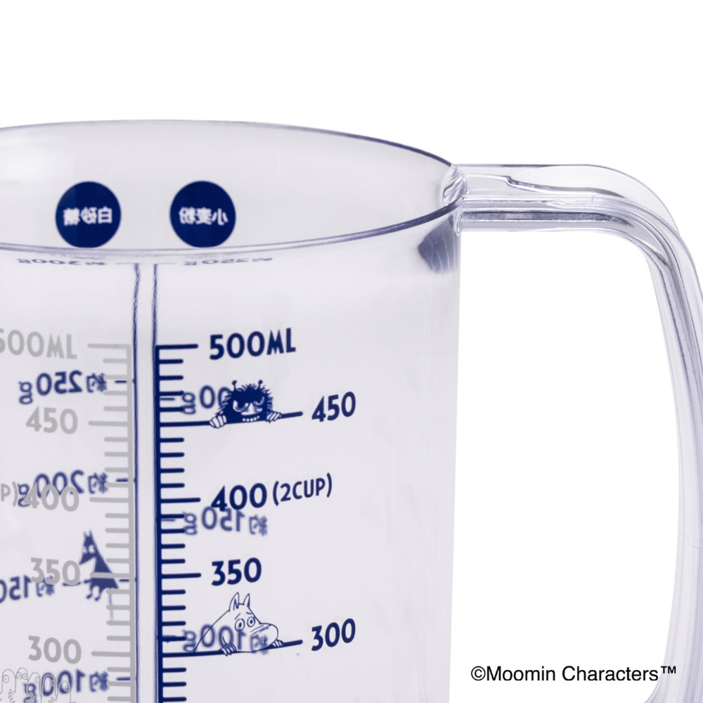 ムーミンやリトルミイのデザインがあしらわれた、かわいい計量カップ。調味料が見やすい2色目盛りです。