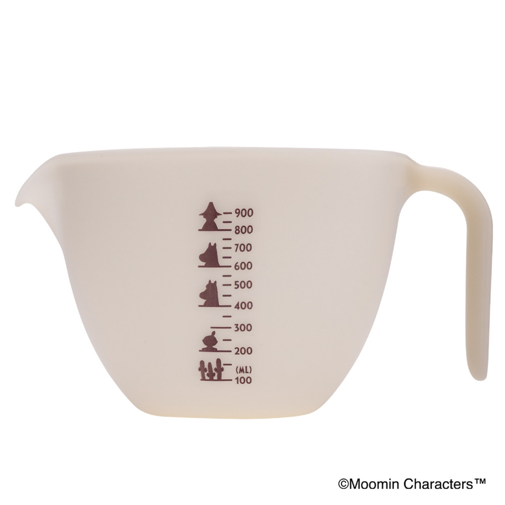 計る、混ぜるがひとつでできる計量ボウル。両面にムーミンモチーフがあしらわれていて、目盛りは900mlまで計量できます。
