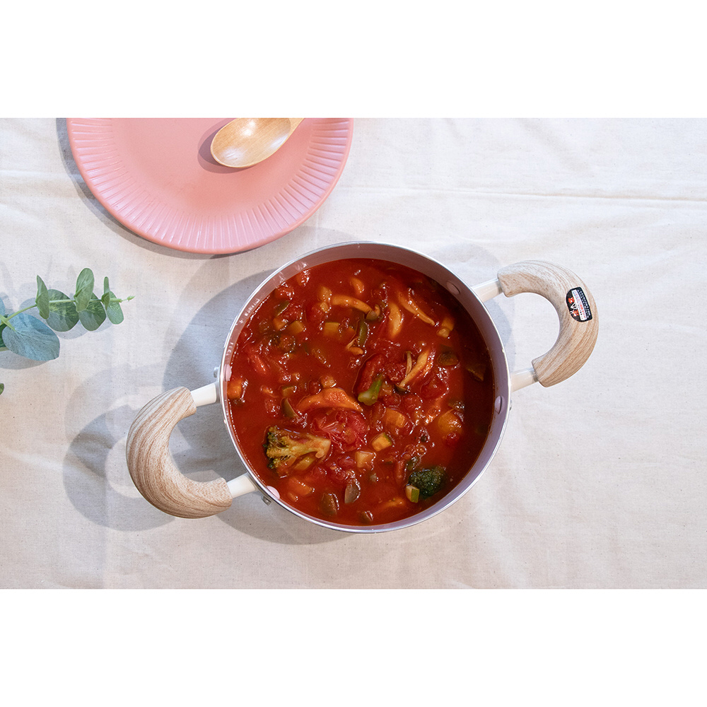 鍋つまみはころんとした可愛らしい形状の木目調デザインでやさしい印象をプラス。ハンドルとも相性抜群で、毎日の調理に自然に溶け込みます。