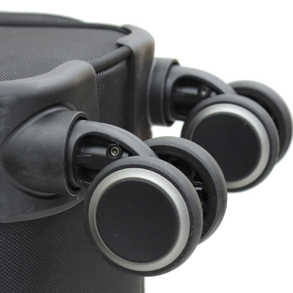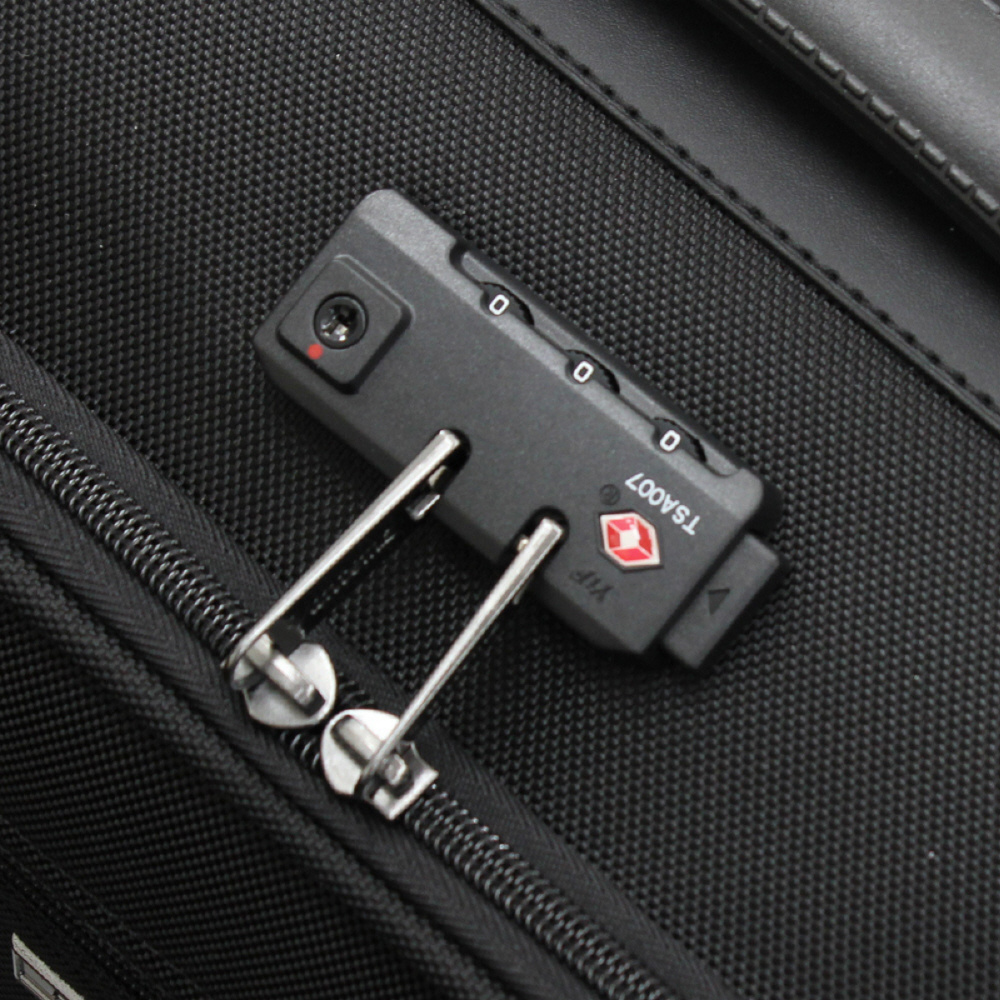 50mm大型双輪キャスターで重い荷物でも安定した走行が可能。TSAダイヤルロック付きで海外旅行も安心です。底足は3個装備し、自立性と耐久性を強化。背面ポケットや収納式ネームカード入れなど細かな配慮も行き届いています。