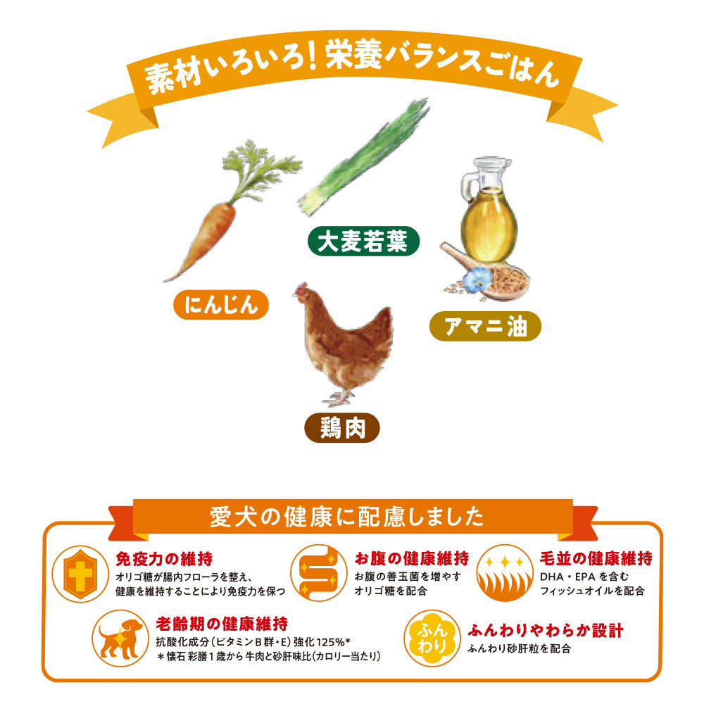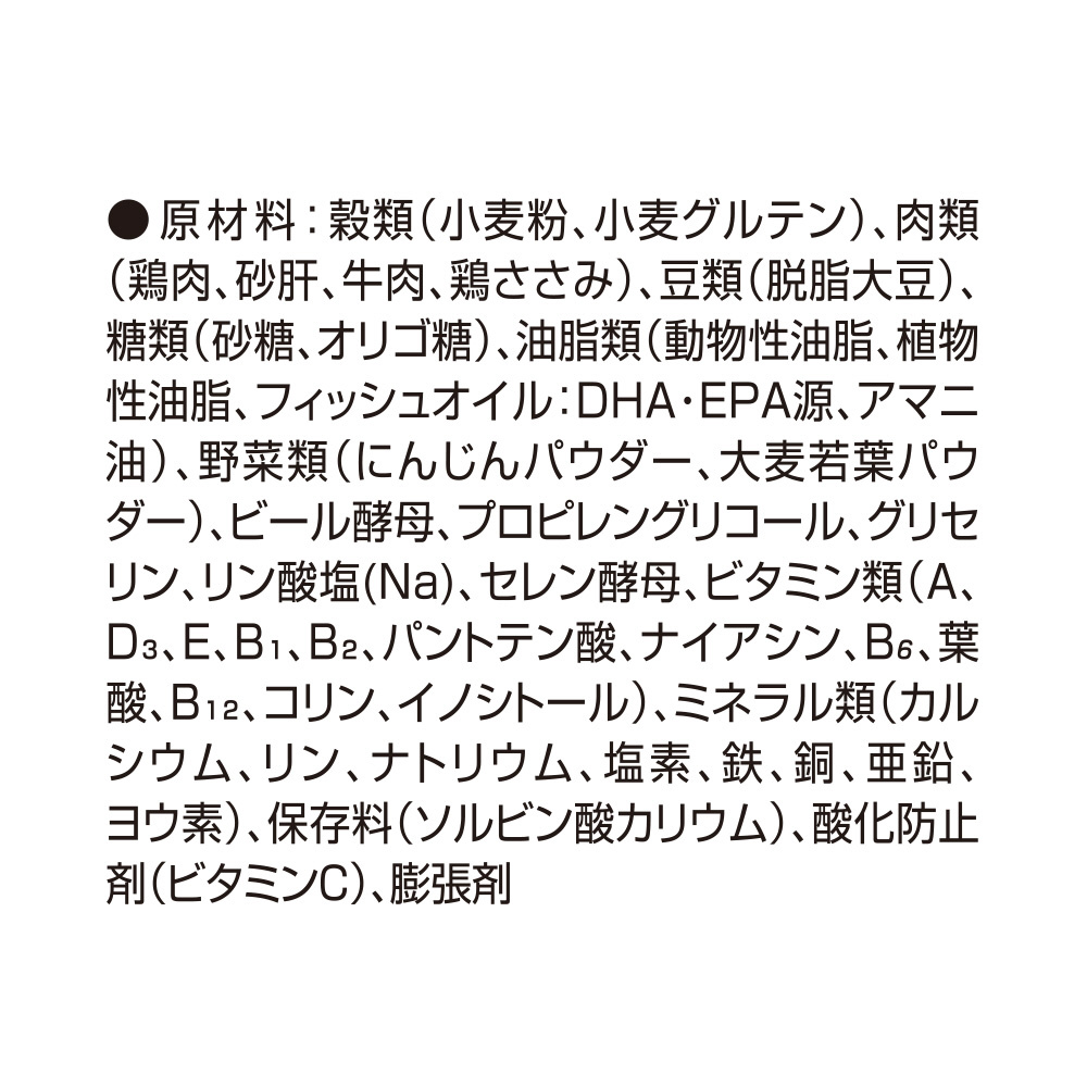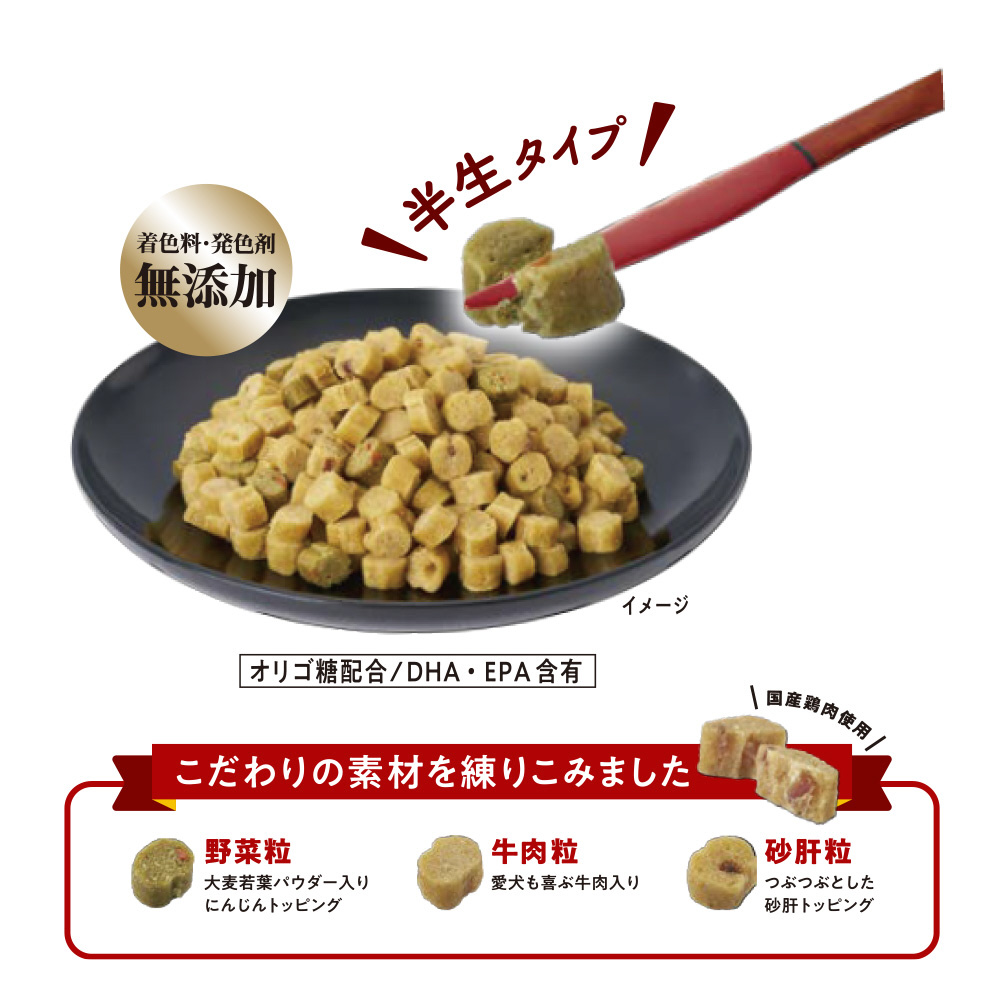 牛肉トッピングと砂肝トッピングがそれぞれ練りこまれた「牛肉粒」と「砂肝粒」。砂肝粒は噛みやすいふんわり設計。オリゴ糖が腸内フローラを整え、健康を維持することにより免疫力を保つ。