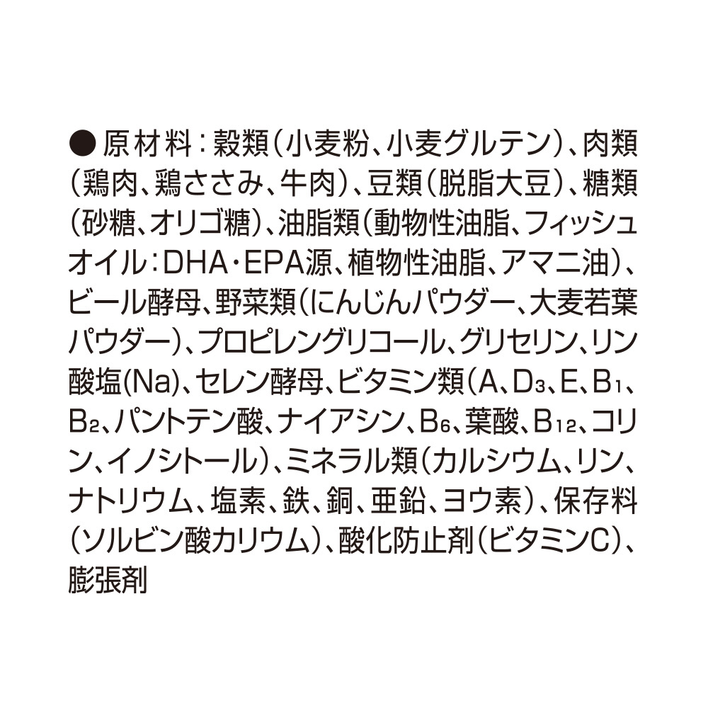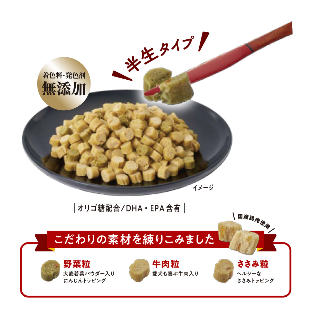牛肉トッピングとささもトッピングがそれぞれ練りこまれた「牛肉粒」と「ささみ粒」。ささみ粒は噛みやすいふんわり設計。オリゴ糖が腸内フローラを整え、健康を維持することにより免疫力を保つ。