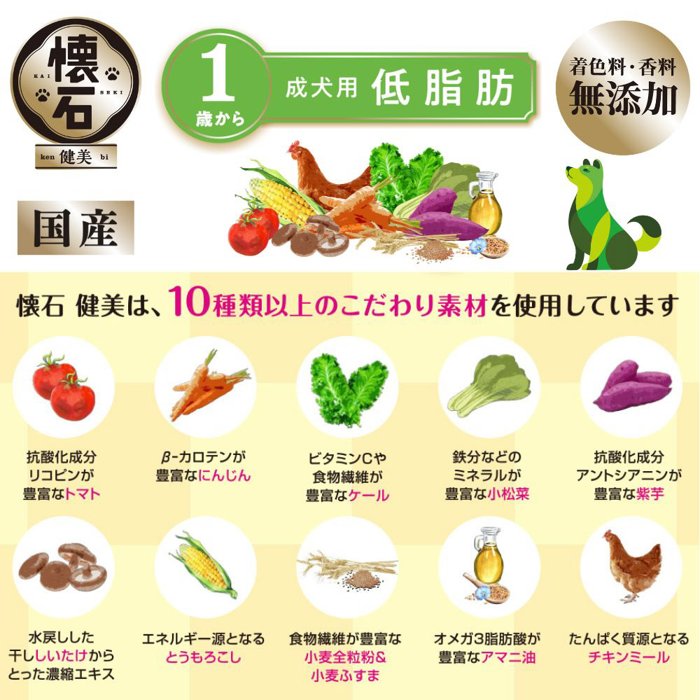 乳酸菌とフラクトオリゴ糖が腸内フローラを整え、健康を維持することにより免疫力を保つ。肥満傾向の愛犬に配慮して、1歳から比 脂質約10%カット(カロリー当たり)