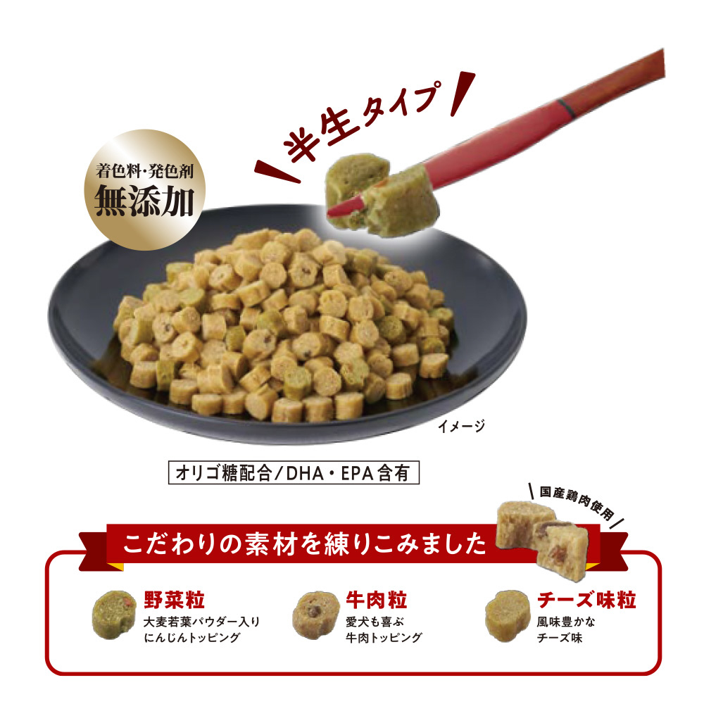 牛肉トッピングが練りこまれた「牛肉粒」と風味豊かな「チーズ味粒」。オリゴ糖が腸内フローラを整え、健康を維持することにより免疫力を保つ。