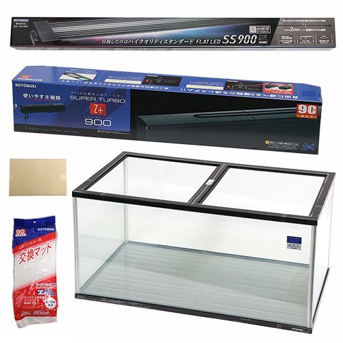 ●90cmフレーム付きガラス水槽:「コトブキアクアリスト900」(ガラスフタKG−122枚1セット付)、・サイズ(約):幅90×奥行き45×高さ45cm(水量:約157L)、・ガラスフタサイズ(約):幅40.8×奥行き27.2cm(ガラス厚:3mm)、※切り欠き部分は約8cmのスペースを確保しております。、●LED照明:コトブキフラットLEDSS900ブラック、・サイズ(約):幅90.8×奥行き7.8×高さ1.6cm(最薄部2mm)、・電源コード長(約):1.85m、●上部式フィルター:コトブキスーパーターボZ+900、・サイズ(約):幅90×奥行き17×高さ16cm、・電源コード長(約):1.35m、各一つずつ