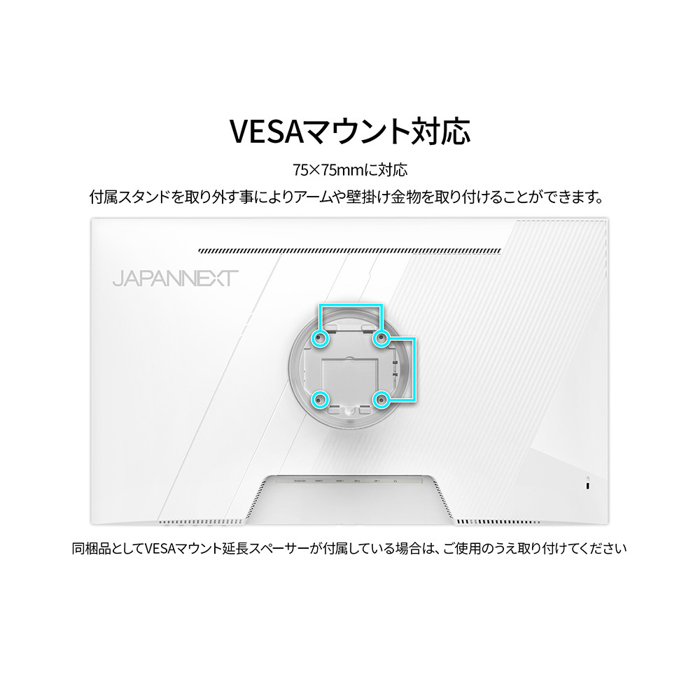 ■75×75mmのVESAマウントに対応、モニターアームやモニタースタンドなどへの取り付けが可能です。