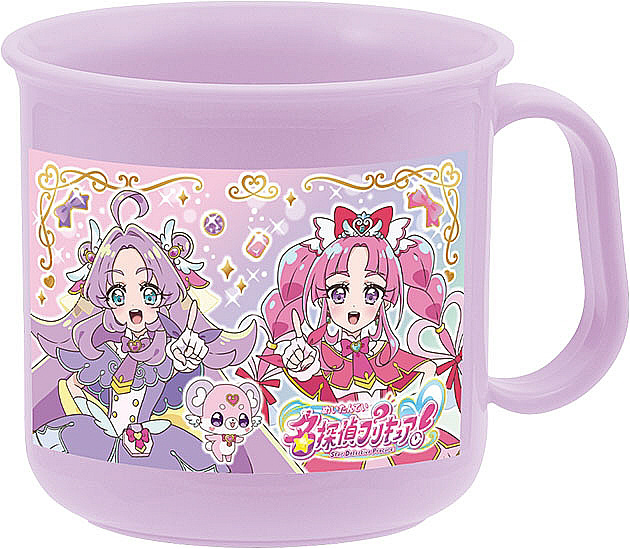 名探偵プリキュアの耐熱コップになります。落としても割れにくく手持ちも付いているので飲みやすいです。電子レンジ・食洗機対応。