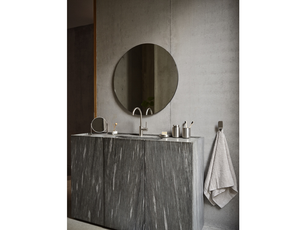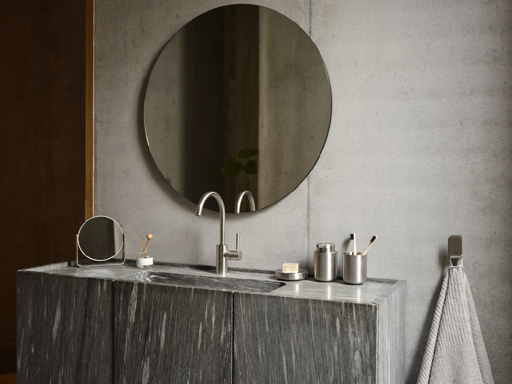人気バスルームコレクション「Ume」シリーズより、特別仕様の歯ブラシスタンドが登場。無駄を省いた洗練されたフォルムと、丸みのある柔らかなラインが魅力のアイテムです。本体は程よい重量感のあるスチール製で安定感があり、洗面台の上でもしっかり自立。シンプルながらも上質な存在感を放ち、光の反射によってマットな質感にさりげない輝きが生まれます。