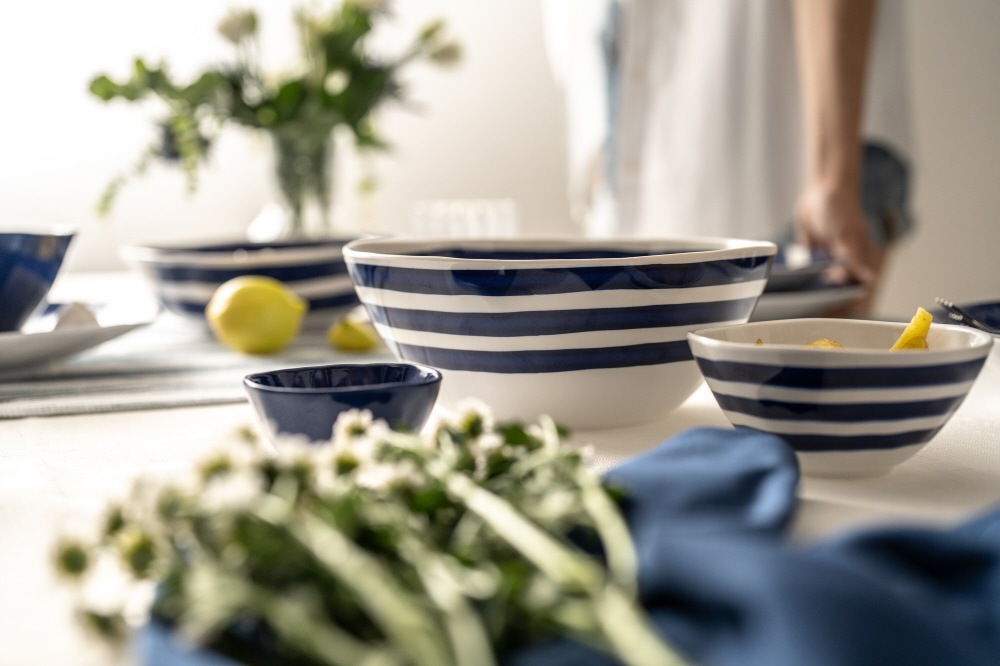 地中海ブルーを彷彿させる深い青が特長的なシリーズ。まるで陶磁器のようなハンドメイド感のあるデザインですがメラミン樹脂製。パスタやサラダはもちろん、ムール貝などの魚介類の料理が良く映えます。