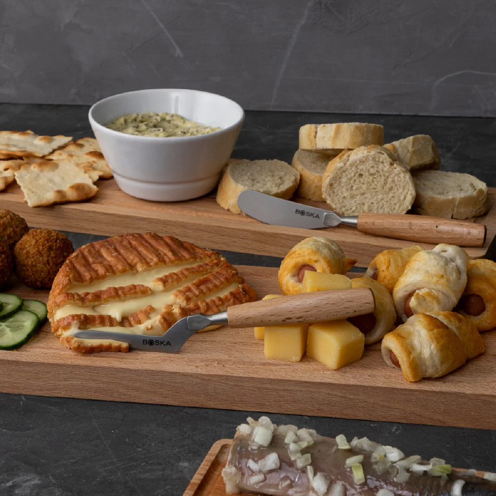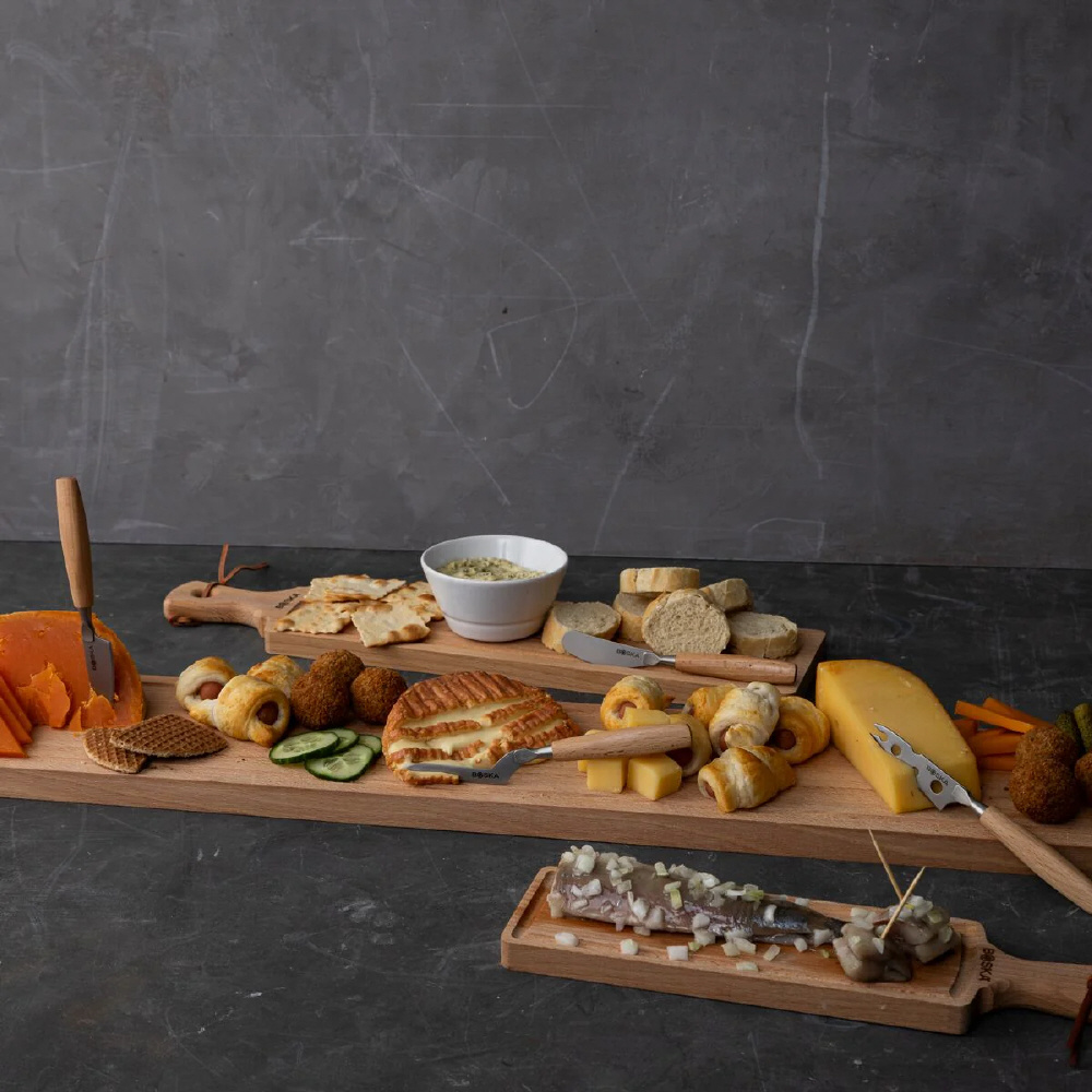 チーズ好き必見のチーズナイフセットで、いつものチーズボードを特別なひとときに。ハーブチーズのスプレッドから、あらゆる種類のチーズのカットまで対応する、実用性とデザイン性を兼ね備えたこだわりのセットです。同シリーズのアミーゴ・サービングボードとの相性も抜群。