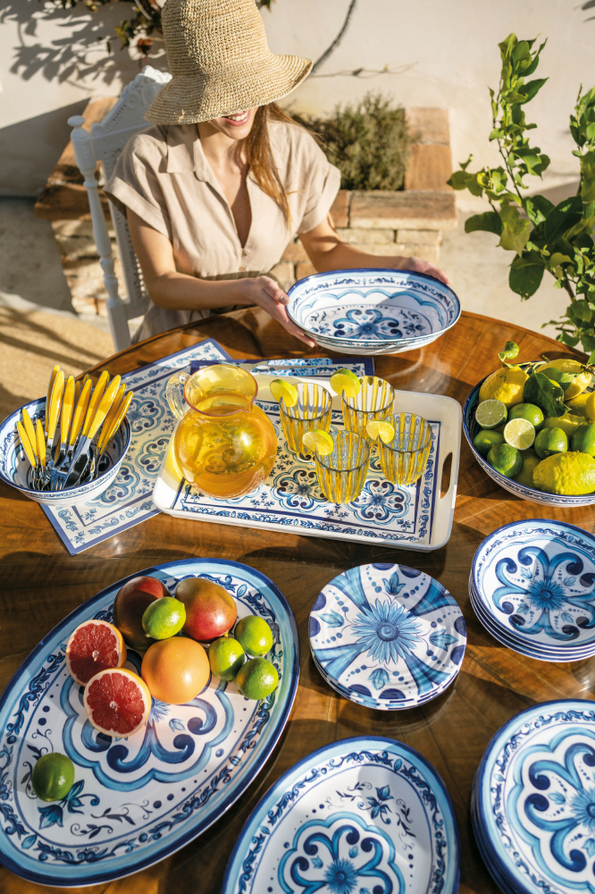 海を感じる「BLUES」コレクションは、夏を思わせる鮮やかなブルーの色と曲線模様、新鮮で冷たい水、ボートやプールサイドからの美しい景色など、海の生命力を感じさせる、エレガントで個性的なテーブルセッティングを演出します。