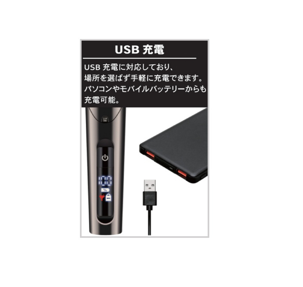 付属品 刈り高さアタッチメント4個(3/6/9/12mm)、USBケーブル(USB Type-A to 器具用プラグ)、 充電スタンド、刃部用潤滑オイル、掃除用ブラシ※USB電源アダプターは別売