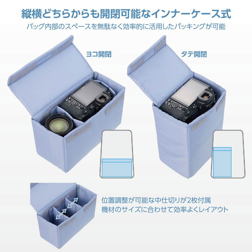 収納の目安 標準レンズを装着した一眼カメラと交換レンズ1本、アクセサリーなど