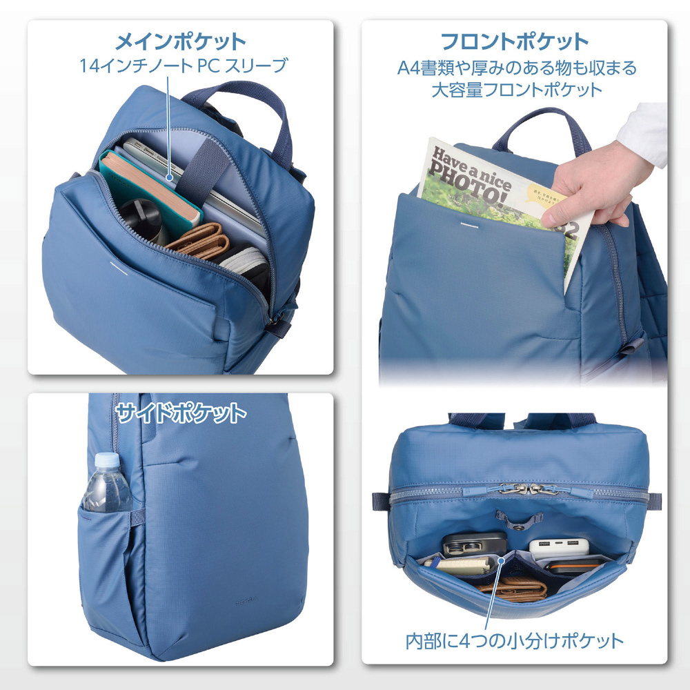 「バックパック 14」は、日常のスタイルに溶け込む都会的なシルエットと、多様なシーンに対応する柔軟性の高い収納力を兼ね備えたモデルです。