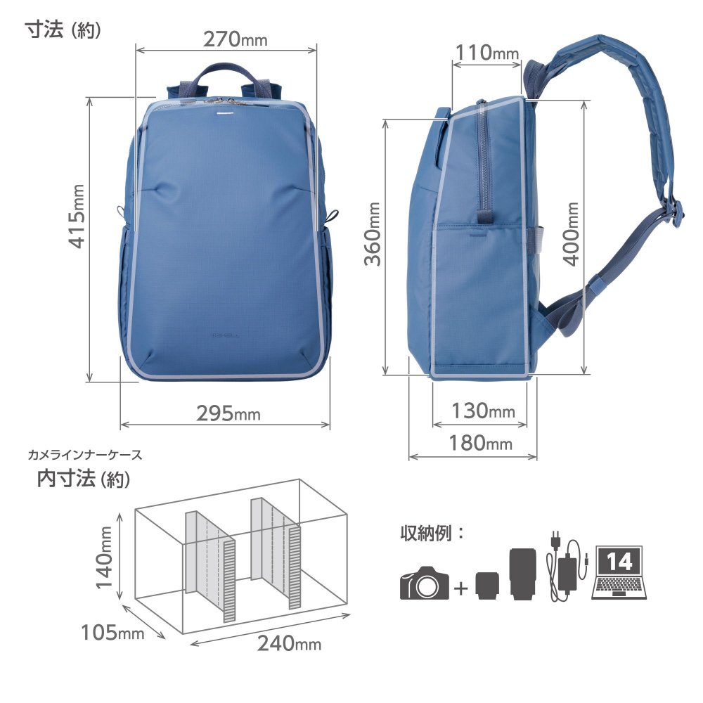 着脱可能なインナーケース仕様に加え、14 インチ PC スリーブや A4 対応ポケットを備え、機材と日用品をバランスよく収納できます。