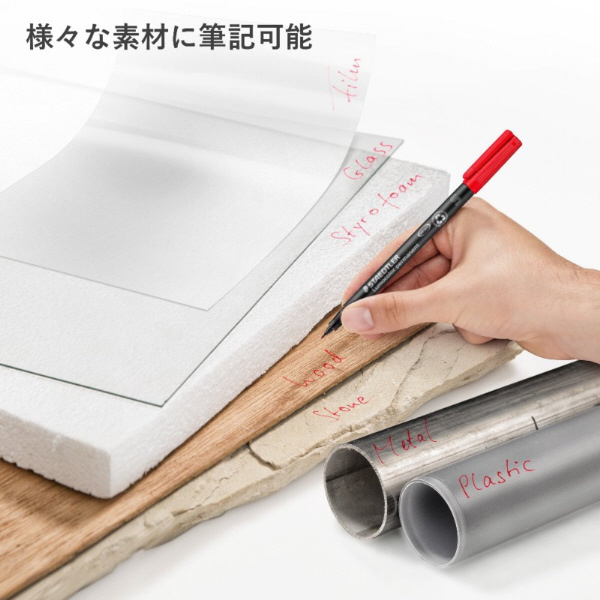 ガラス・陶器・金属・プラスチック・木材・布・OHPフィルムなど様々なものに書けます。また独自のインクがペン先に薄い皮膜を作り、2日間はペン先の乾燥を防ぎます。(※ISO554)筆記後、3〜6秒程で乾き、すばやい作業にも最適です。