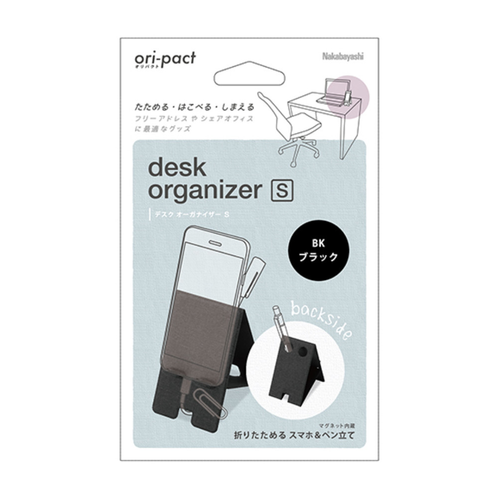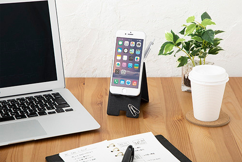 折りたたむと持ち運びできるコンパクトサイズ。充電しながらスマホや小型タブレットが置けます。背面にペンが立てられる二つの丸穴。クリップなどがくっつくマグネット内蔵。
