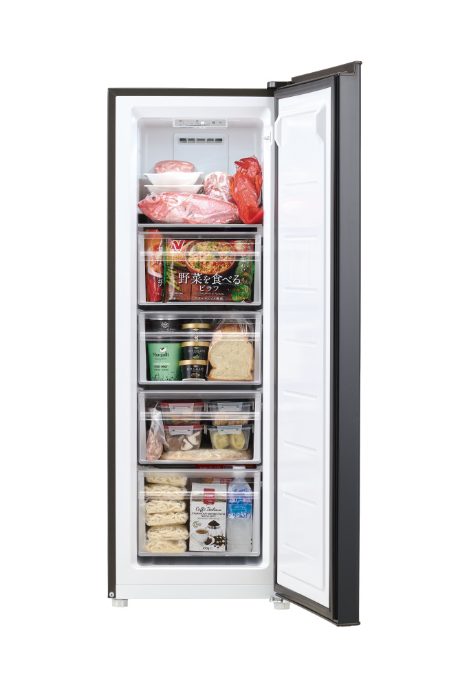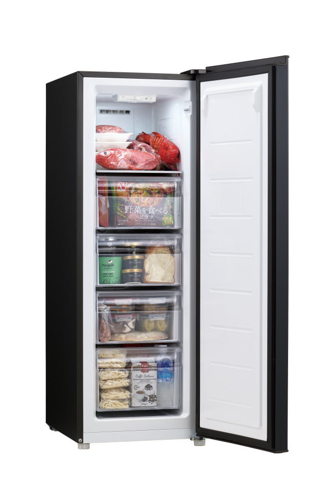 整理整頓や収納のしやすさにこだわり設計した庫内は107Lを確保。収納力や設置場所など使いやすさを追求した幅45cm。限られた空間にも設置しやすいサイズと程よい収納力は、セカンド冷凍庫にぴったりです。