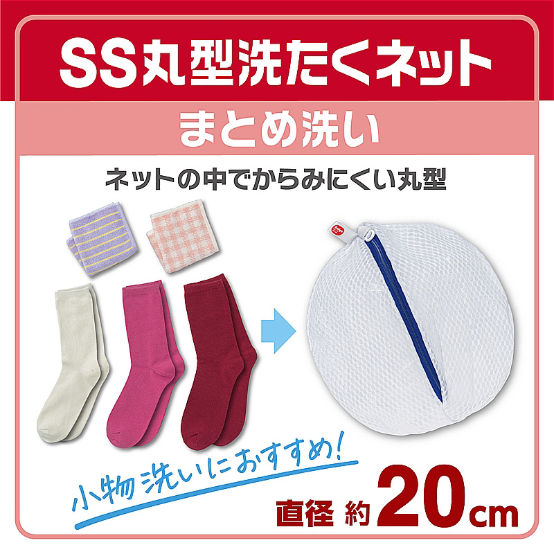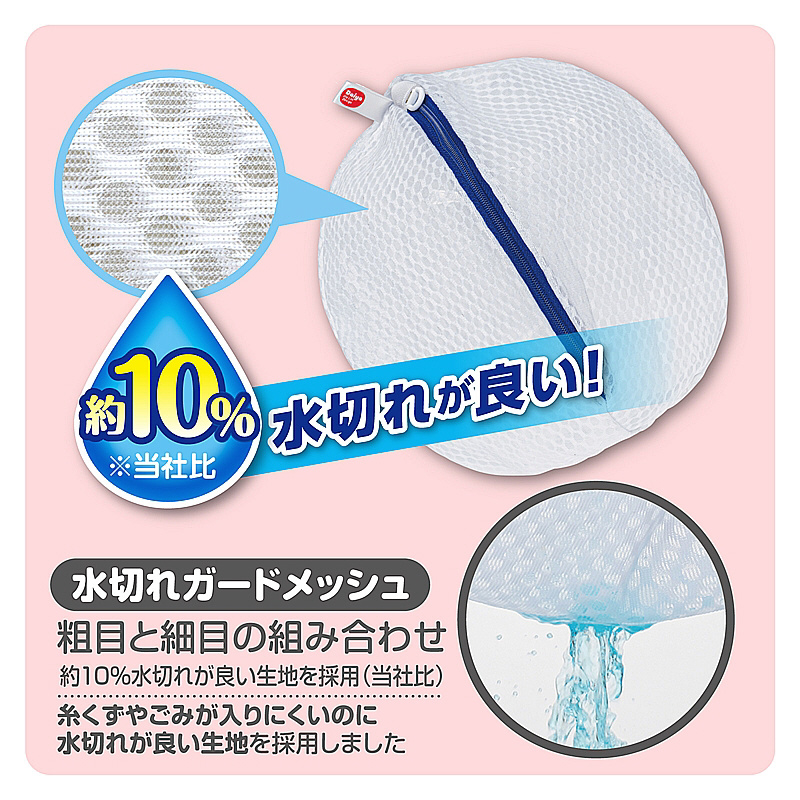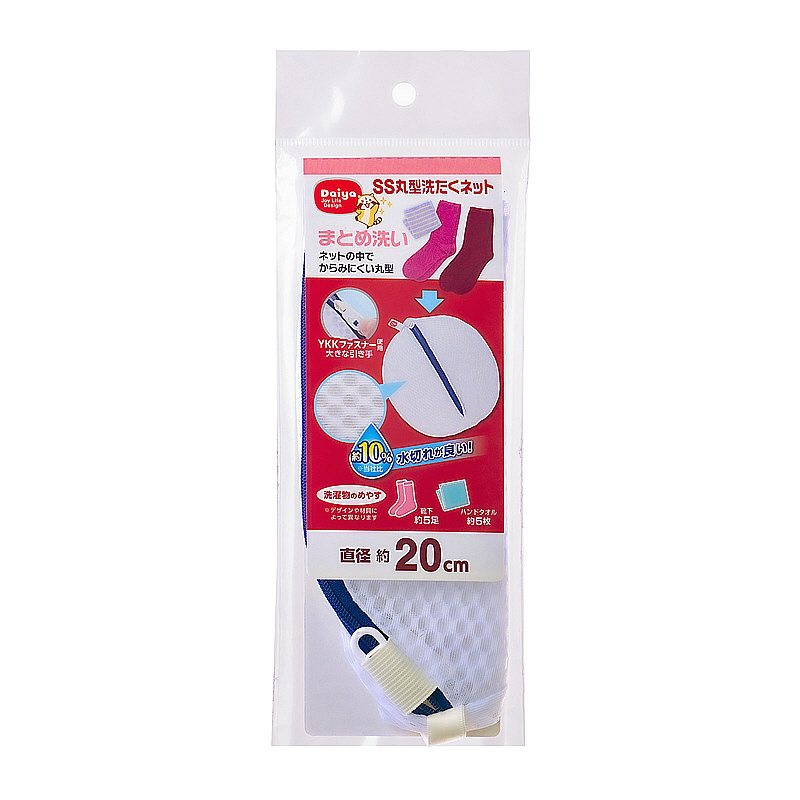 小物のまとめ洗いにおすすめ。ネット内でからみにくい丸型。絡まりやすい衣類をまとめてスッキリ洗えます。(靴下約5足、ハンドタオル約5枚)YKKファスナー使用。ファスナーが開けやすい大きな引き手。掛けて収納しやすいループ付き。水切れガードメッシュ生地を採用。約10%水切れが良い。※当社比。糸くずやゴミが入りにくいのに水通しが良い生地です。