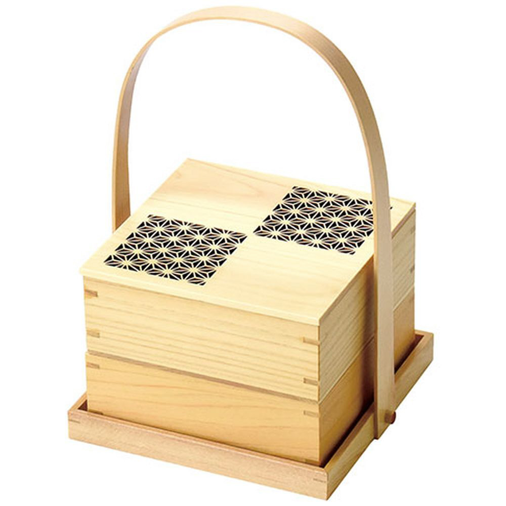 用美 業務用 ひのき細密・手提付正角2段料理箱 麻の葉 yamaco38327