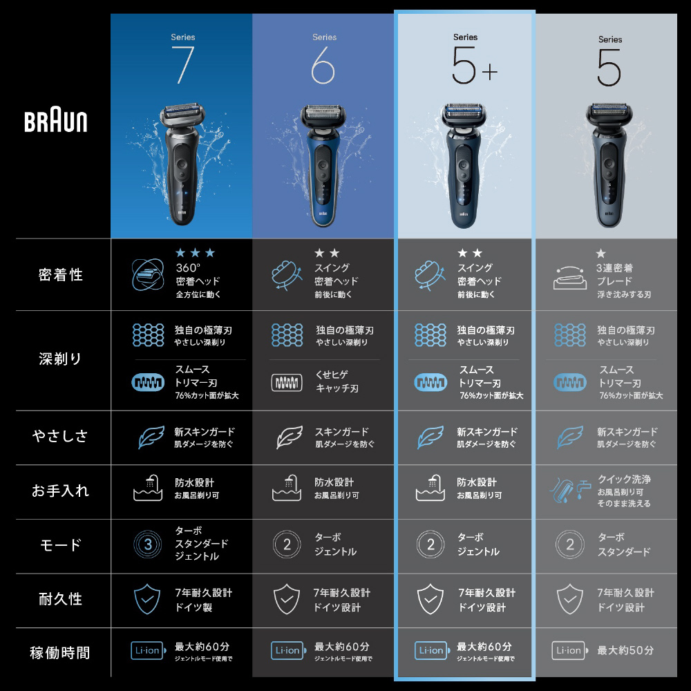 時短&やさしい「ひと剃り」。ブラウン シリーズ5+は、3連密着ブレードを搭載したシェーバーで、肌の凹凸に刃がしっかり密着。