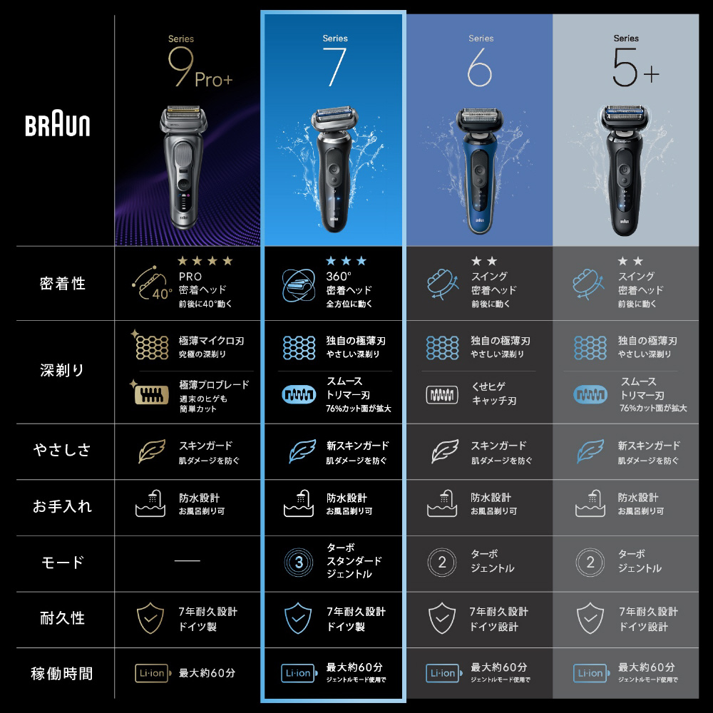 やさしく、深く剃れる「ひと剃り」。ブラウン シリーズ7は、3連密着ブレードを搭載したシェーバーで、肌の凹凸に刃がしっかり密着。