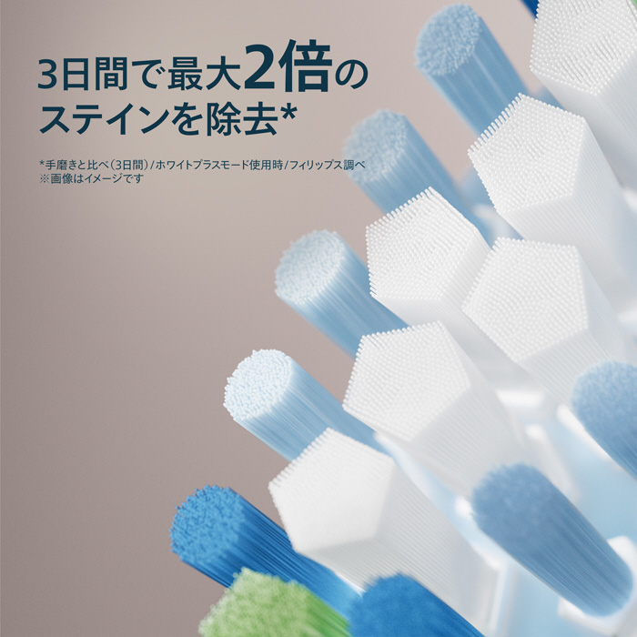 五角形の形に密集した硬いブラシが中央に配置されており、白く輝く歯に磨き上げるのをサポートして、3日間で最大2倍のステイン(歯の着色汚れ)を除去します。(*)