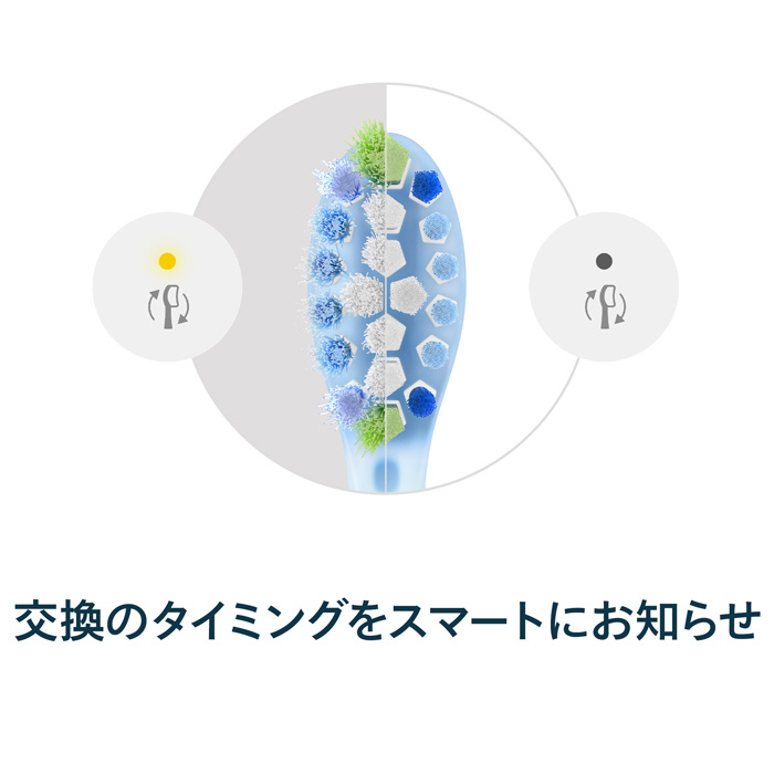 ブラシの一部の色が変わり、交換の時期をお知らせします。またハンドルの機種によってはブラシヘッド交換お知らせ機能(*)によりランプで時期をお知らせします。※交換目安:約3か月