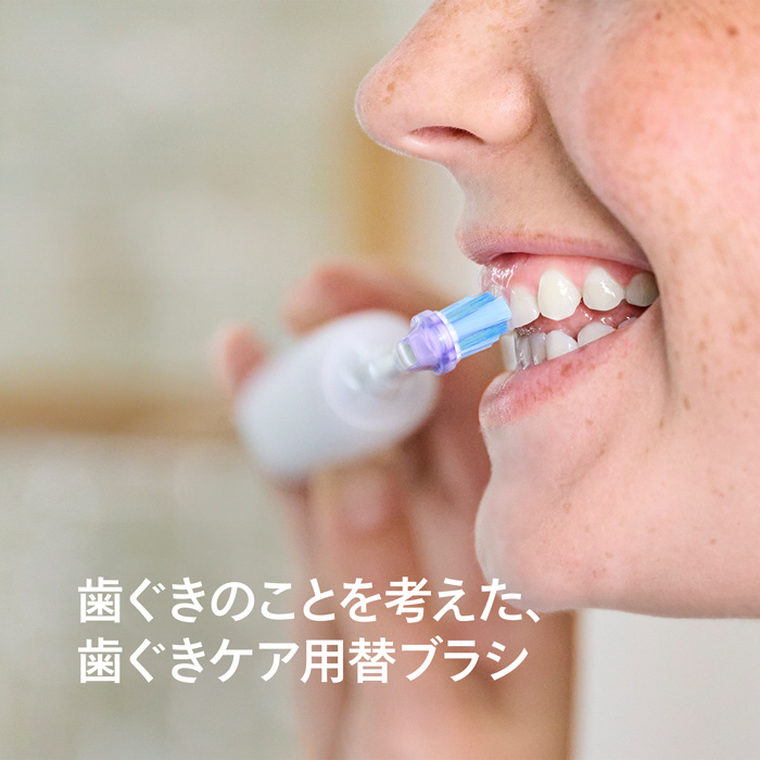 丸く植毛された毛先が歯ぐきを傷つけず、隅々まで汚れを落とします。また、毛先は柔らかく、歯肉炎が発症する歯肉の縁を効果的にクリーニング。ヘッドのサイズが小さいため、届きにくい奥の歯ぐきまでしっかりとブラッシングできます。